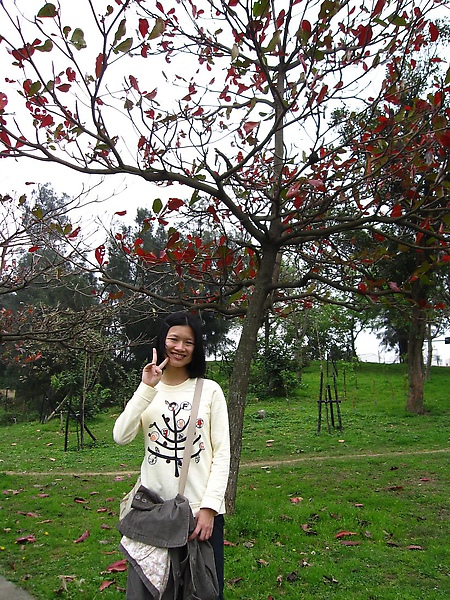 我們在新竹公園散步,欣賞葉片深紅稀疏很有意境的樹木,