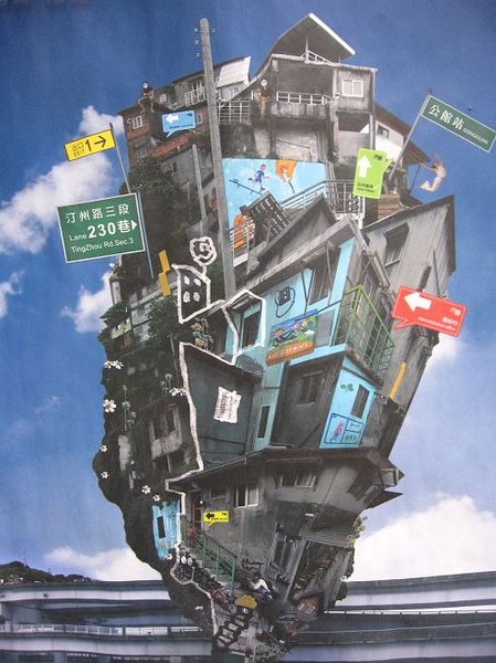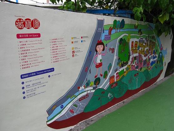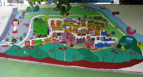 從汀州路轉進小巷,牆面上用童趣的筆觸漆著寶藏巖的地圖。
