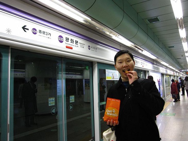 韓國的地鐵裡可以吃東西,這幾天大概因為天氣冷,