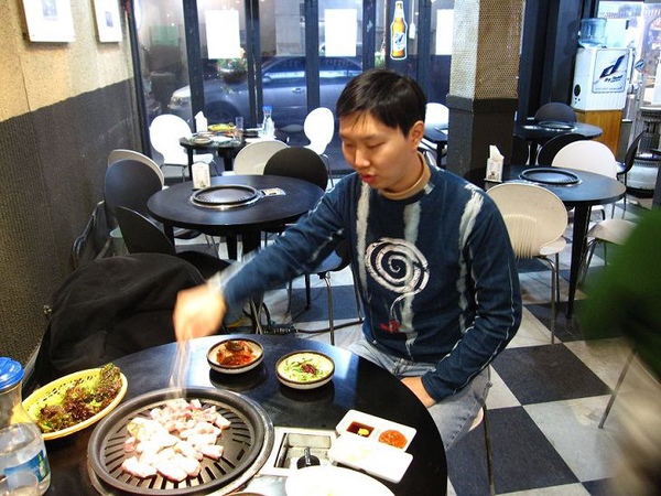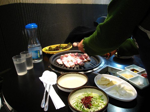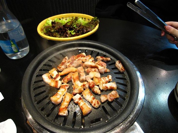 肉條在烤盤發出嗶嗶剝剝的聲音,聽起來就覺得很美味。