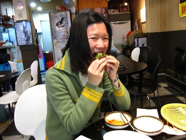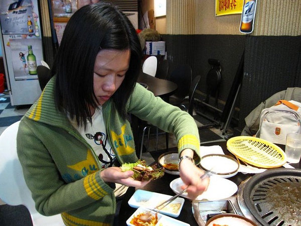 然後再依喜好把泡菜、蔥絲、洋蔥等包進葉子裡。