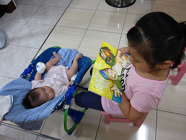 ▲4月23日,小米姊姊念睡夢鄉的故事給小瓜聽