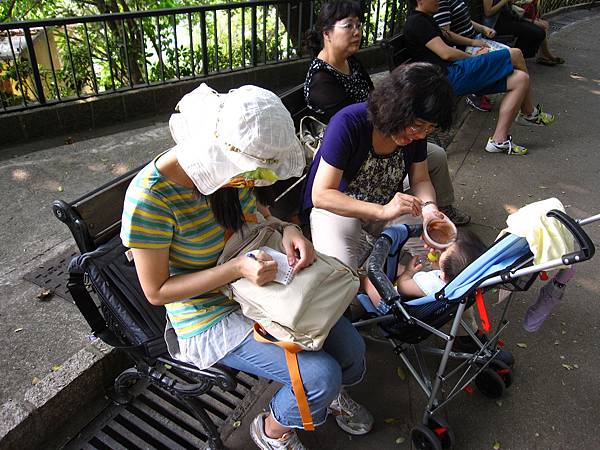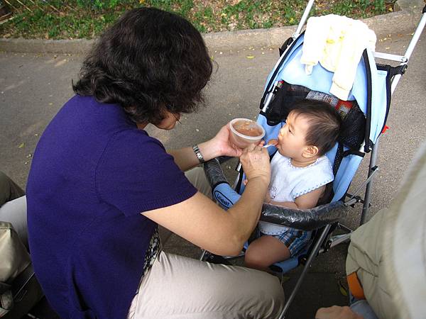 小瓜寶寶在涼爽的樹蔭下吃食物泥