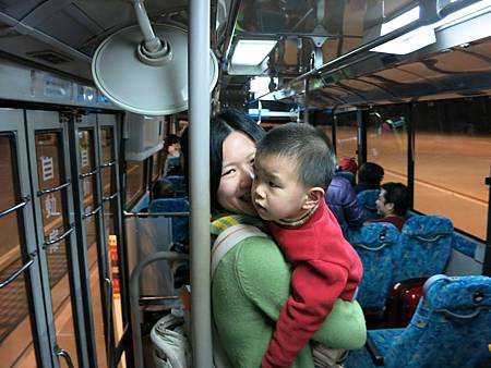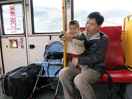 p往機場的高鐵接駁車。左邊是小瓜的推車、我們的20吋和24吋行李箱,
