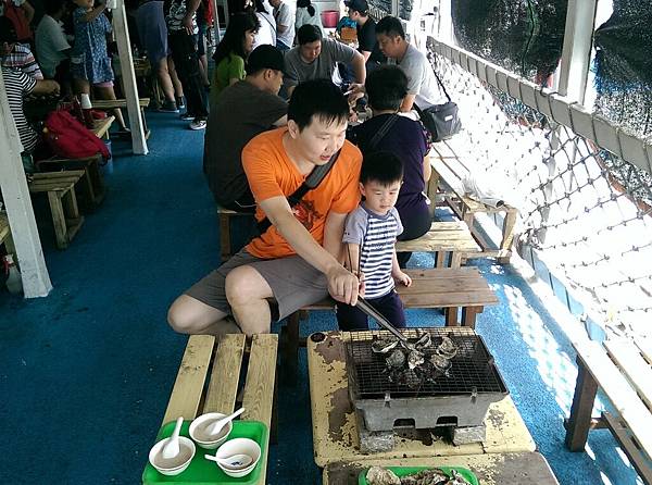在海上平台碳烤牡蠣、吃粥、讓小小孩體驗垂釣…