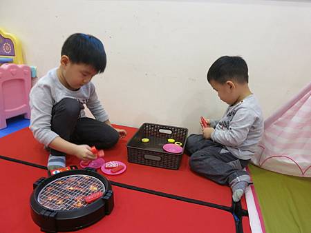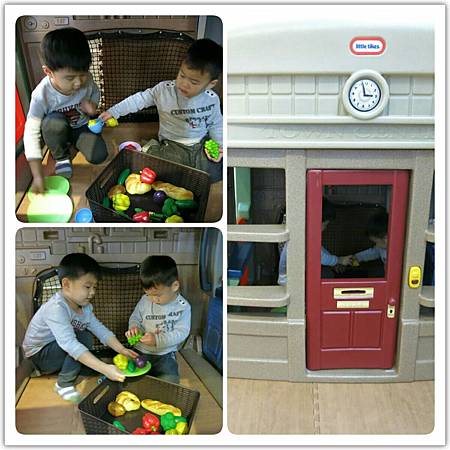 1. 兄弟倆把食物模型搬進小屋子裡玩扮家家酒